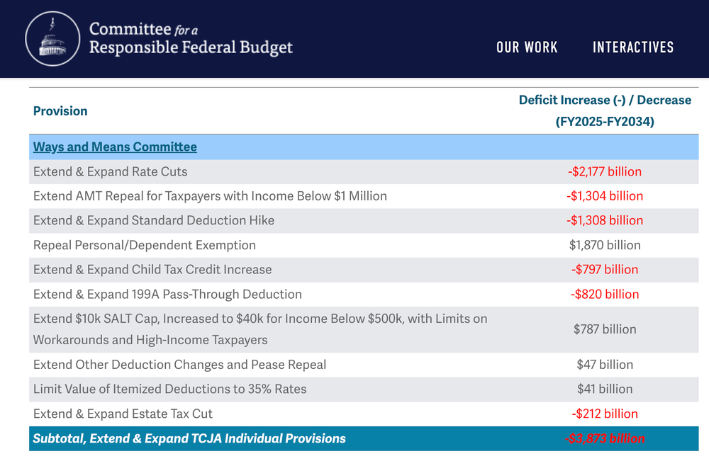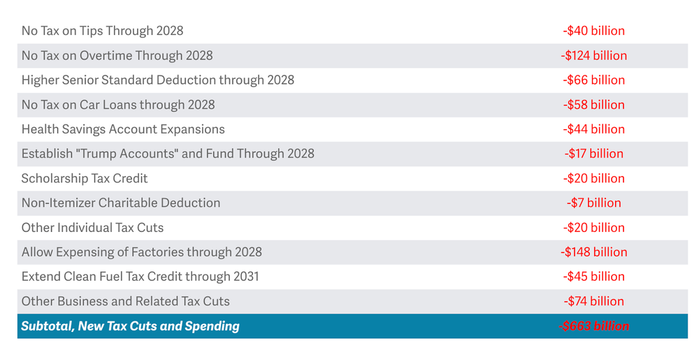 Take, for instance, the widely publicized and celebrated “no tax on tips” and “no tax on overtime.” Reading the fine print, you’ll learn it’s only the first $25,000 of tips and $12,500 of overtime that are deductible for certain occupations, as long as you earn less than $150,000 per year. Together, these two measures cost just $164 billion. For context: At least 15x as much money is allocated to households earning more than $500,000. The promised soundbite of “no tax on Social Security” was diluted to a relatively inconsequential $6,000 bonus deduction for retirees over 65, which will—you guessed it—expire after just three years.
